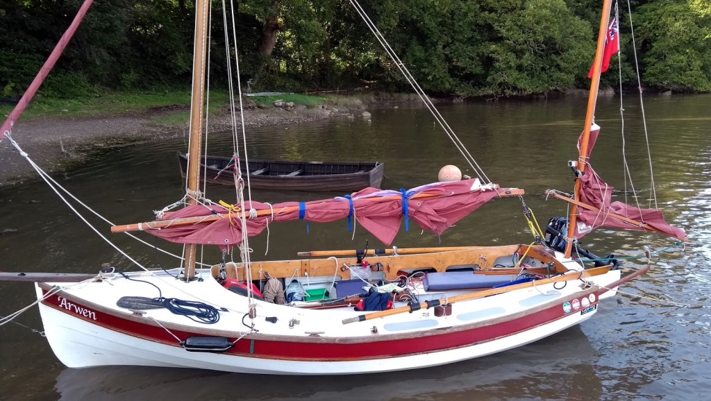 Meanwhile…..this week’s main blog post is partially based on sailing up the Tamar river one day in my very old gaffer which I had sailed around from Ipswich. Just s we entered the Tamar proper there was a small red and white Yawl with tan sails that I thought I would easily catch up with and have a chat with as we sailed up towards my home port of Calstock.