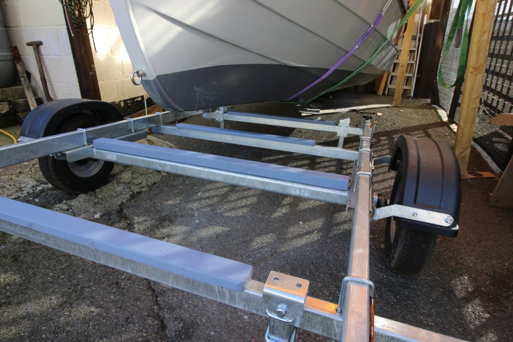 In both pictures the bolted on bunk riser bars are in the down position to make it easier to roll the trailer out and these would normally have plywood pads covered with camping mat foam to support and protect the hull. I may in the future add a third bunk riser each side and also might change the additional cross member for a longer one…long enough to mount a simple docking arm each side.