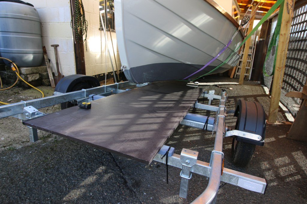 The first photograph below is of the bare trailer frame with the axle brought forward and an additional cross member added behind the axle and which is placed directly where the boat’s fourth frame is. In the future there will be a lot of weight just above and between the axle box and the additional cross member because there will be a large fixed AGM battery in the boat just there. The grey packing pieces create a level plane across the axle box and three of the cross members , the second photograph then shows the ‘deck’ position – the deck is 18mm Buffalo board which is Birch cored plywood and both very heavy and dense . That is fastened through the spacer pieces and two of the trailer cross members – as I write I am waiting for galvanizing spray paint to protect the bolt holes.