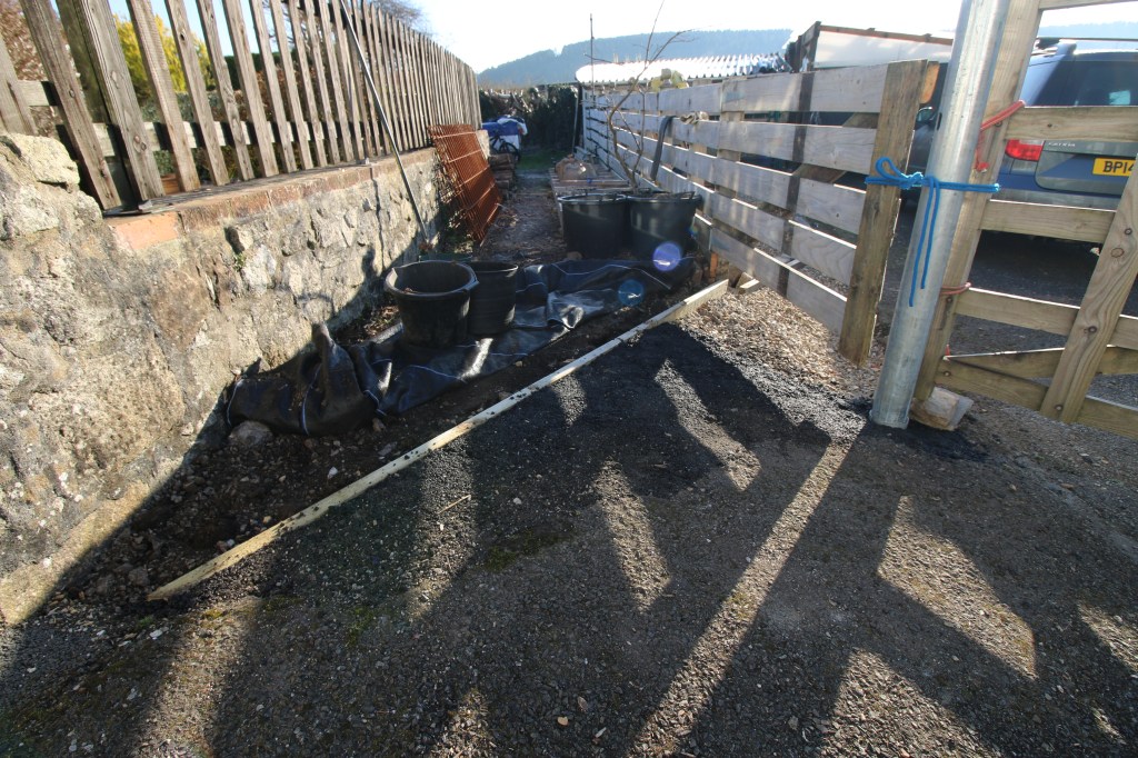 We have an unusual land ownership issue here in that we completely own the boundary on that side of the drive as does our neighbor on that side – there’s a narrow ‘lane’ in between which is unregistered and which used to give mine workers access to the mine which was once there. My modification is to remove a section of fence and turn that into a hinged section which would give a better angle onto the shared access drive – to make that work though iv’e had to do three days of heavy work to re model the driveway and lane surfaces……right now i’m waiting for the builders merchant to drop off another 200 Kg of tarmac to finish the job with.
