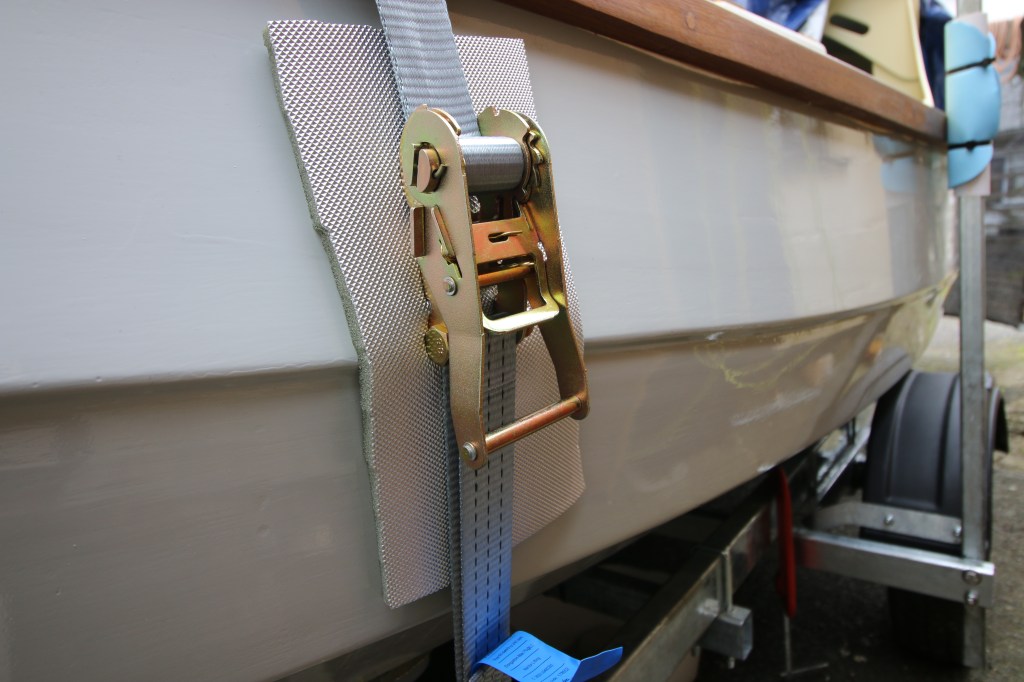 Luckily, I found that the lower section of the trailer maker’s ratchet strap was 100mm shorter so the actual ratchet now sits almost clear of the hull and only needs a piece of camping mat taped on to pad the hull. It still leaves a problem, I think, of a lot of potential down-force on the boat’s coaming if I tighten the ratchet down too much…..working on that problem right now.