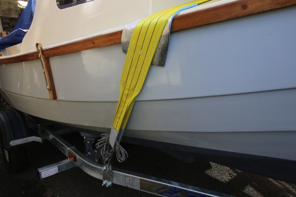 For the forward strap I tried a completely different approach as whatever system I use goes over the ‘box’ of the foredeck anyway (much stronger) but also needs to act a restraint against heavy braking ; the general rule being to not totally rely on the trailer’s own winch post to hold the boat back. My solution is to use one of my 1 ton lifting straps , shackled directly to the tie down point one side and laced hard to the tie down point on the opposite side – as a rigger it seems a sound approach because I have attached the tie down points aft of where the strap passes over the foredeck and which sits up against the tabernacle and cabin front.