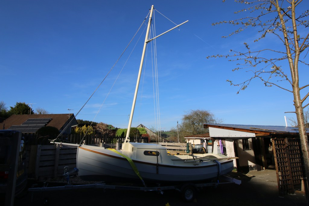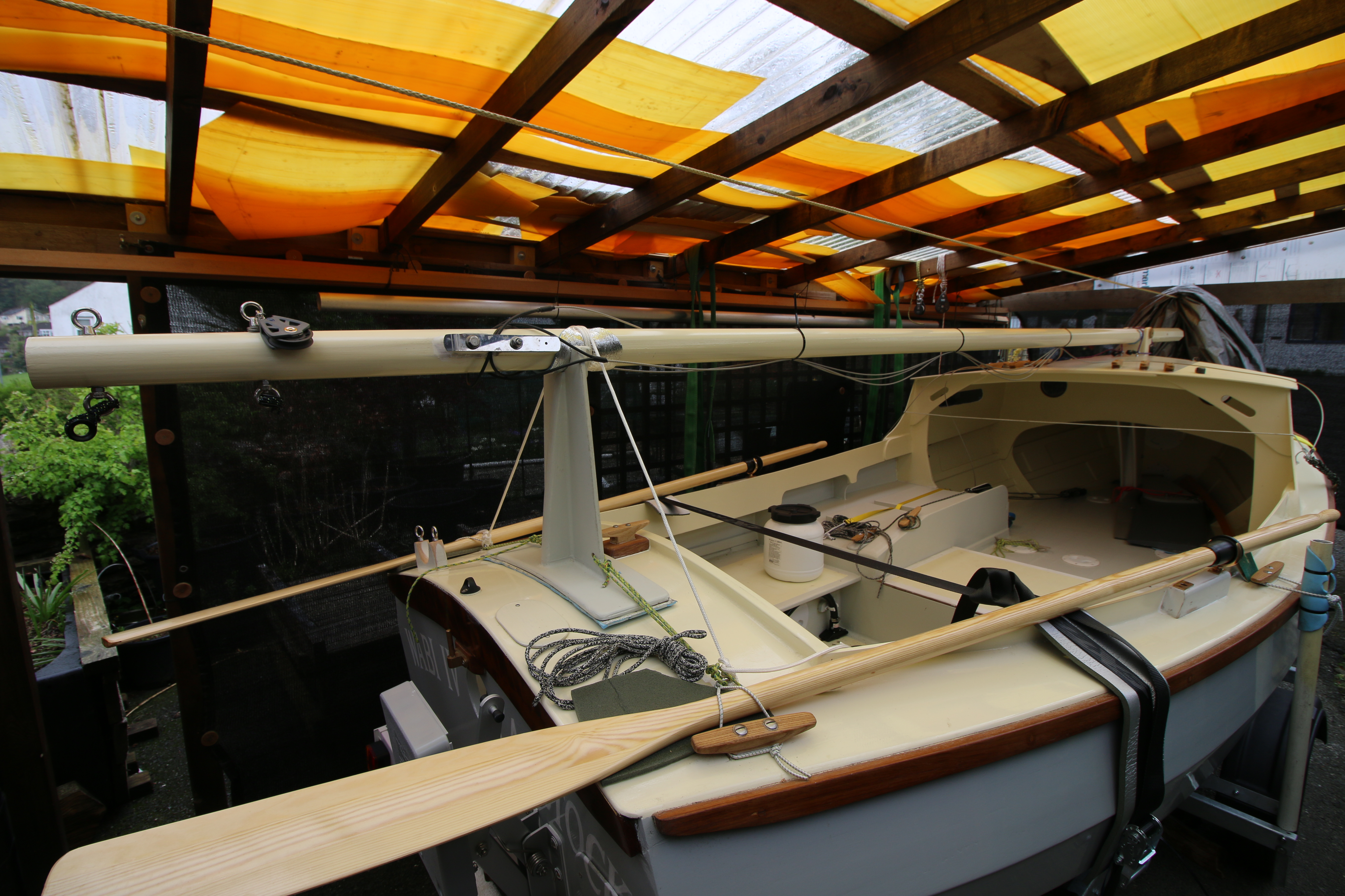 At this point I can do the pivot and hoist myself but it does need an extra person to help with lowering it because of the way my hoisting tackle works (with a jammer) at the bow. When I can get the parts I will set up the hoisting tayckle so that I can run it up the mast with the 2 part jib halyard as and when I need it and it’s tail will come back to a cleat or jammer on the cuddy roof. An interesting thing is that I left the rig up overnight for the first time and left it set up quite ‘hard’ ie firm. This morning I noticed that the shrouds had slacked off just a bit which suggests that I have stretched either the wire rope of the shrouds or their lashings…..whatever, all it needed was a tiny bit of extra heave at it’s inner forestay and it’s all good again.