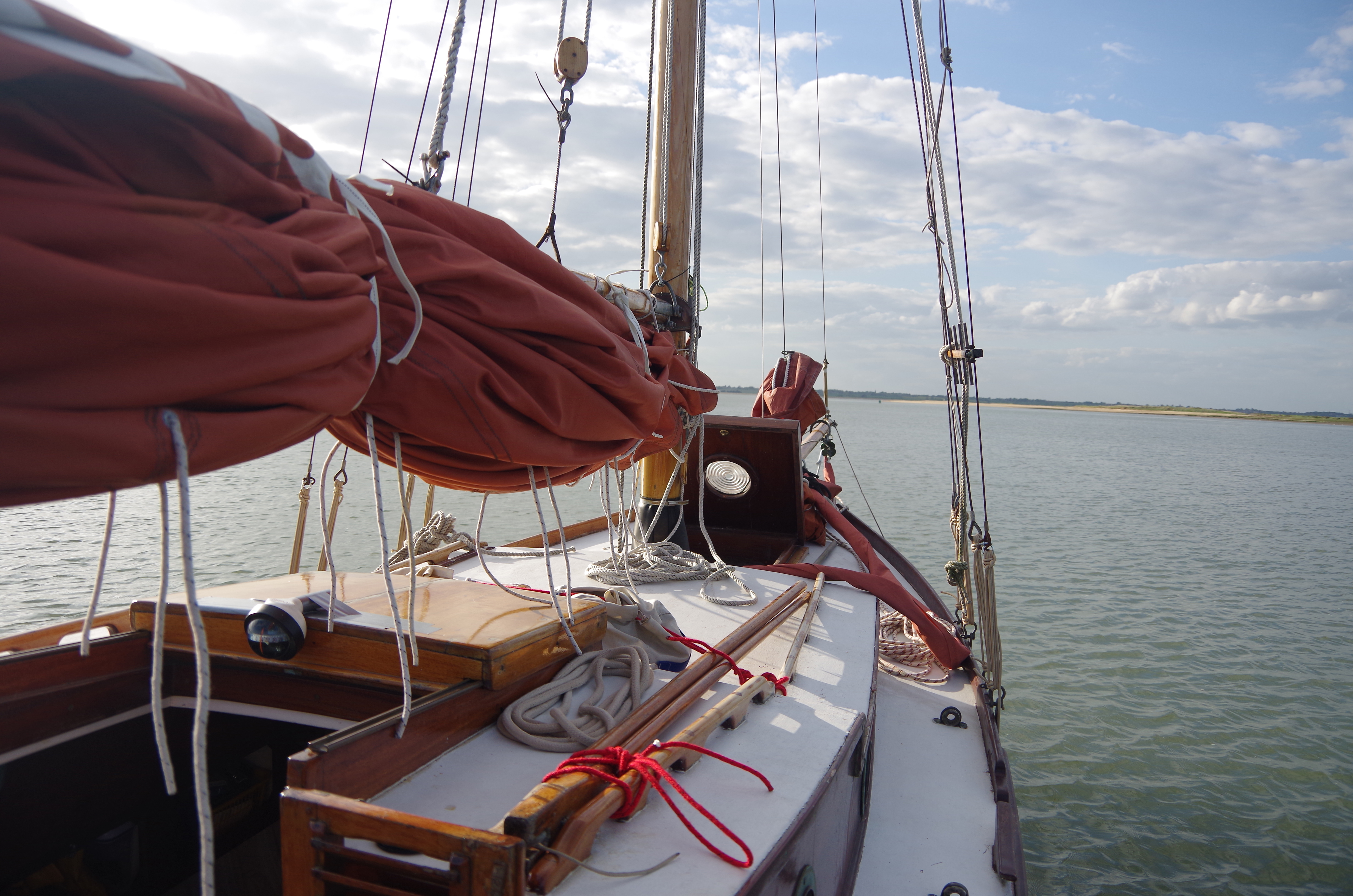 Several years back I was aboard the 80+ year old gaffer that i’d found and bought in Ipswich on the east coast and which i’d decided to make a summer project of by sailing it all the way around the the south coast to get it back to my mooring in the Tamar river, which, if you don’t know it is the main river inland of Plymouth. After a few days spent just cleaning the boat out and changing all of the shroud lashings I left Ipswich, sailed and motored down the river Orwell, had an uncomfortable night rolling in the wind against tide slop somewhere just west of Harwich docks and the next day escaped that and sailed across to the Walton backwaters…..which was surprisingly lovely given that basically it’s bordered by thick grey/brown mud and marshland.