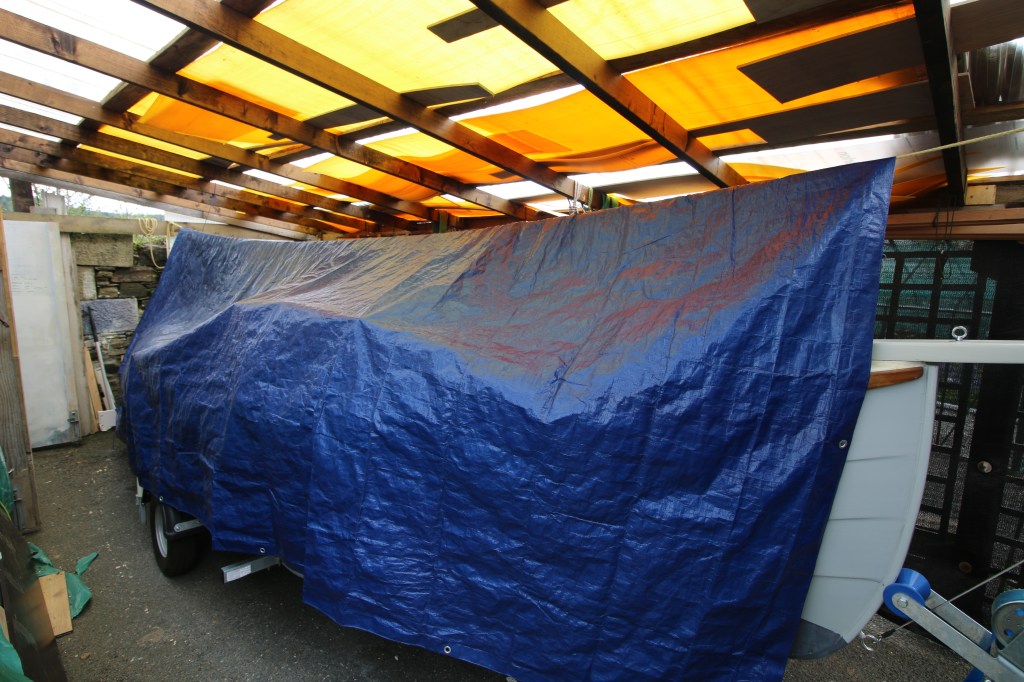 Right now my immediate need is to make a simple shelter such that I can camp out on the boat when I launch it and probably live alongside a pontoon while I work out the next round of work – with that in mind iv’e ordered a smaller heavyweight tarp that will be very close to optimum size when the mast is down but raised above it’s road crutch. With access to several different sizes of camping tarp at home I played around with my two ‘in-use’ tarps partially to see if either would do the job – the answer was that the big 4 x 4 tarp would do but would need extensive modification and I would much rather keep it as is for the camping trips that we still do.