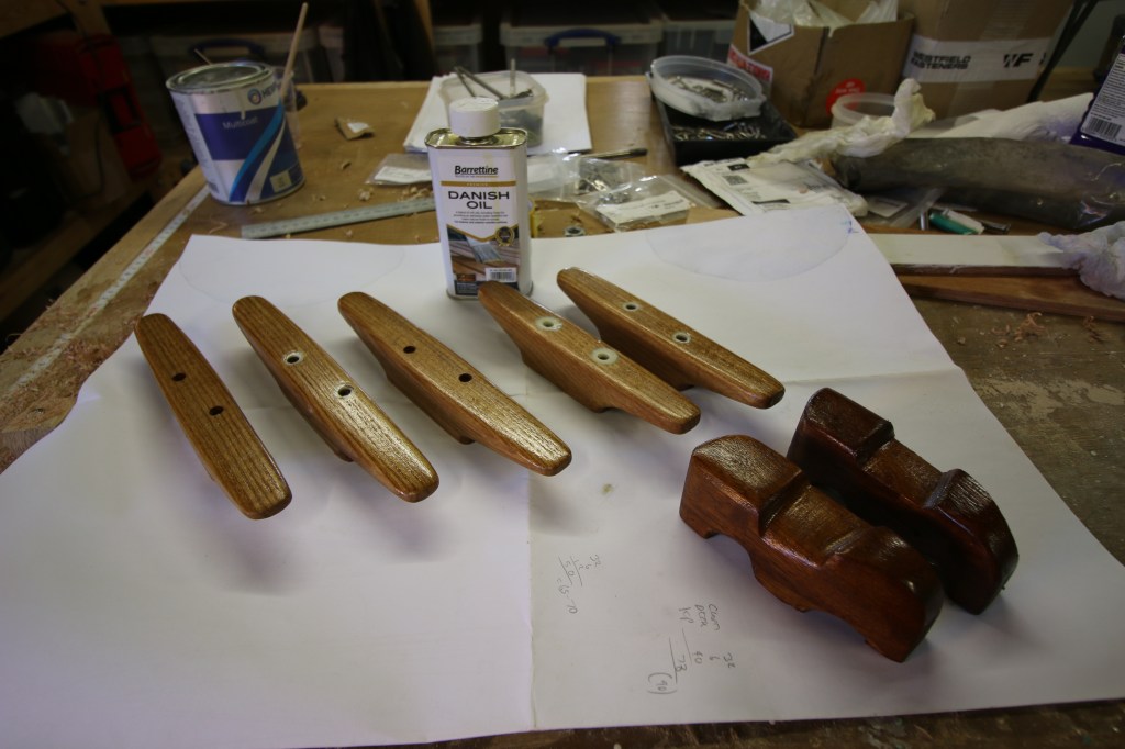 To jump to the car chase and sex scene then here is one way that I saved a shed-ton of hard cash during the build and it was through the simple expedient of learning to make an Ash cleat and then working out a method of making lots of them in one go. Iv’e now made and fitted 15 simple Ash cleats – I really had to think there for a moment because there are 6 mooring cleats, 6 halyard cleats on the cuddy roof and then a few odds-n-ends scattered about. Now, my original intention and desire was to have cast Bronze cleats to go with the cast Bronze rudder fittings and chainplates but a single cleat of the same size as my spring/anchor cleats is upwards of £35 a pop – so that would have been 15 x £35-£40 and I haven’t even bothered to work that out. As it is just fitting the rudder with gudgeons and pintles was a £200 + job and the chainplates a cool £40 each but I consider both of those money spent necessarily on crucial components.