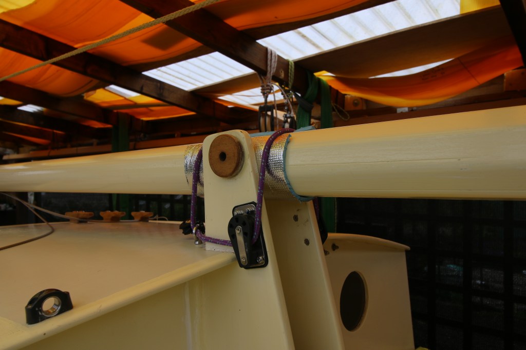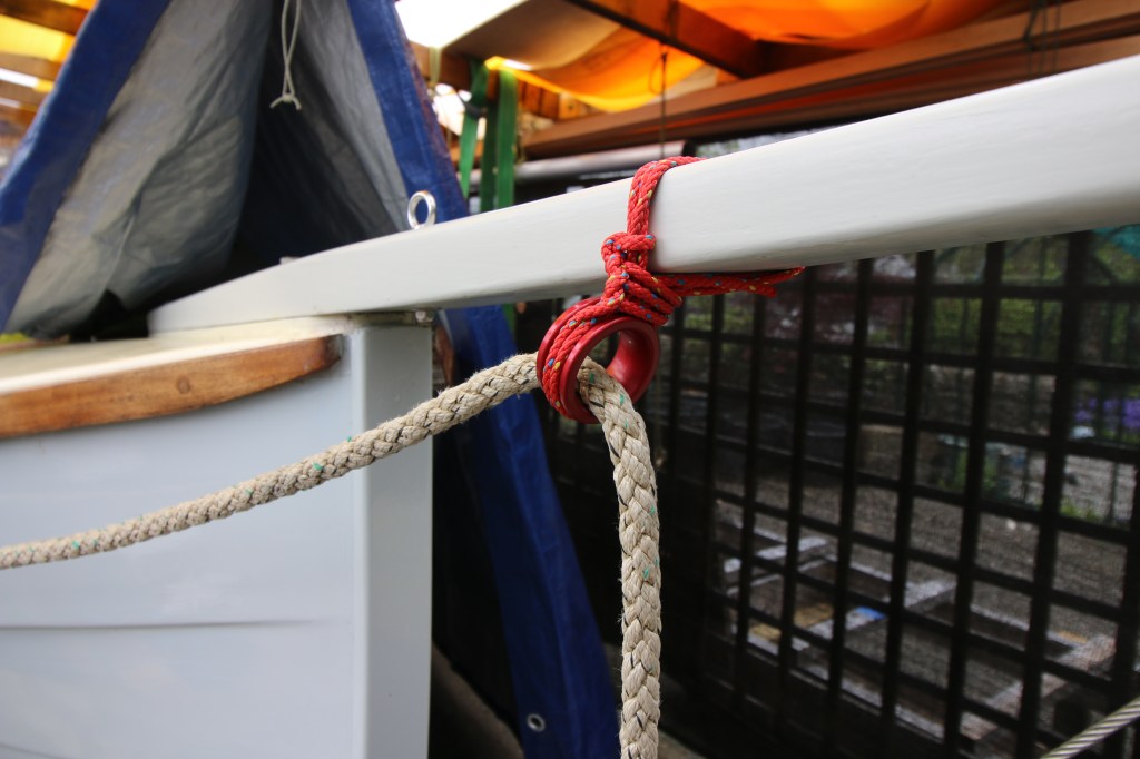 Low friction ring lashed onto the bowsprit as anchor lead – and if you’re wondering that’s for an all-warp or mostly warp anchor rode.