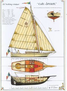 Right now, again in blog time, i’m just taking a coffee and writing break in between shaping and gluing the pieces on the workshop bench that I hope will become my experimental laminated gaff saddle and rocker block combined and the reshaped gaff spar end. The reason why there are 2 gaff saddle/rocker block assemblies on the bench is that the forward one is the actual one for this gaff spar while the one behind I am making for a potential curved gunter rig that might be the basis of rig 2 for the boat. While right now I am heading towards completion of a fairly conventional gaff sloop it might in time become a cutter with a larger stays’l, smaller balance jib on a longer bowsprit and with the curved gunter mains’l similar to one of the late Daniel Bombigher designs below.
