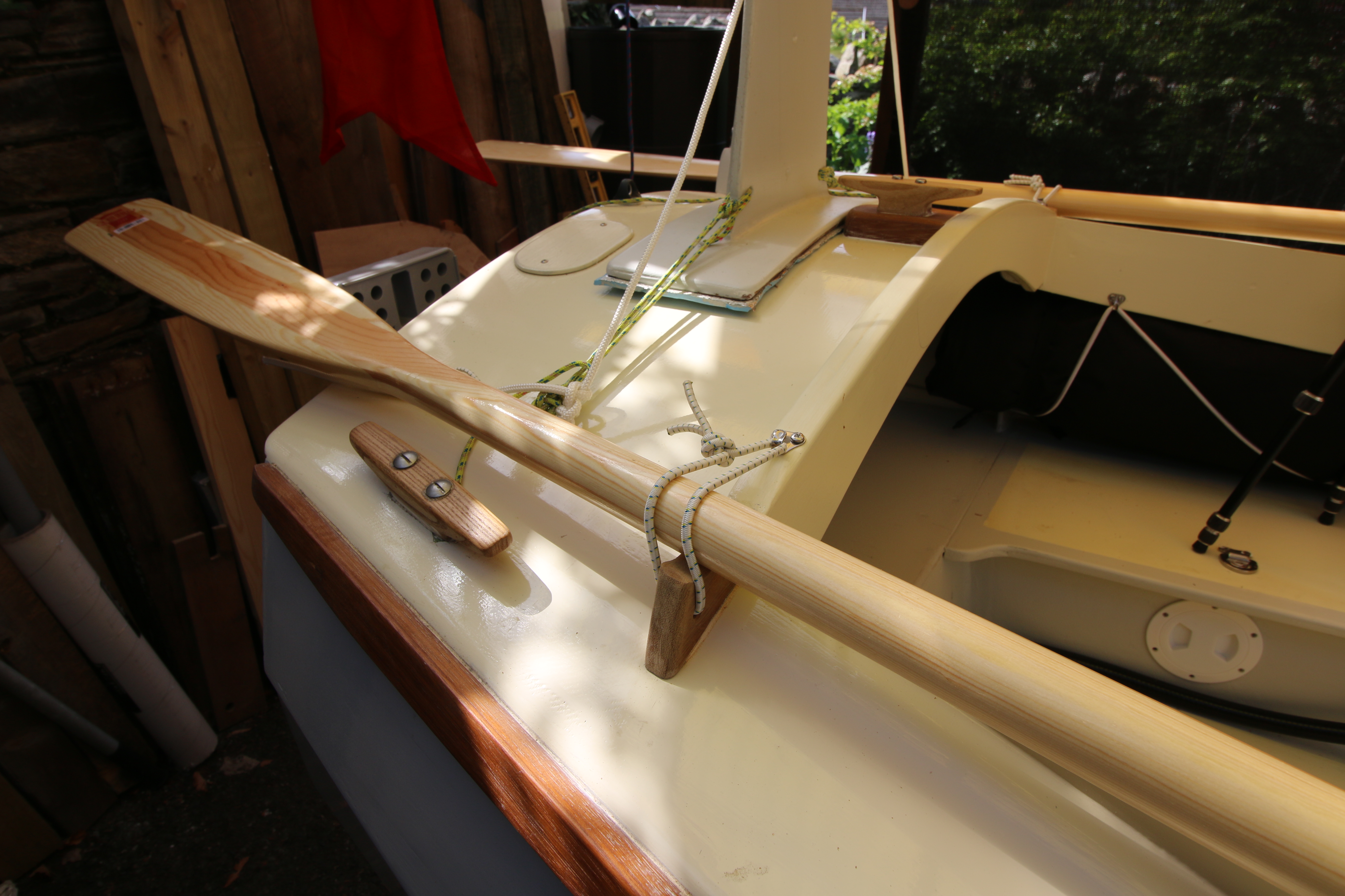 Cleats and anchor chocks made from a stick of Ash bought to make canoe paddles from and some unused Sapele bought for the centerboard construction. The greater cost with the 15 cleats are the 30 stainless steel mushroom headed bolts to attach them with and the stainless steel nuts to fasten them with.