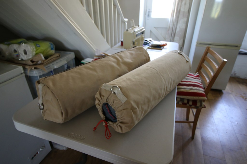 The last part of my thinking about doing as much as I can for myself with simple materials this week is to not buy a set of conventional fenders and fender sox but to make one piece of kit do 2 or 3 separate jobs ; my plan is to take the old pair of camp thermarests which might function aboard WABI IV as seating and to give them a second use as additional buoyancy and a third use as soft boat fenders. I won’t use them in that role very often and to be honest I don’t intend them to take much pressure so my plan is to make a simple set of heavy duty covers/bags from them out of some scrap polyester canvas and hang them on the outside as and when I need fenders….otherwise stuff them under the side decks and tie them in as buoyancy.