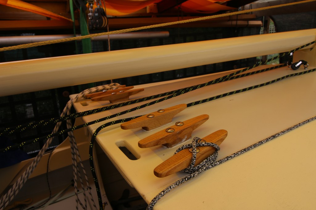 In a previous post I wrote about keeping costs down by not buying nice but expensive fittings such as cleats and blocks but instead making as many functional detail parts as I can – cleats for example. There have obviously been important parts that iv’e had to buy such as the rudder fittings but so far I have saved (or simply not spent) a large pile of cash just on the cleats alone as the Bronze cleats that would have looked nice on the build work out at £35-£40 per cleat and so far iv’e made and fitted some 14 cleats by making, in my opinion, quite nice ones from a stick of Ash once intended for canoe paddles.