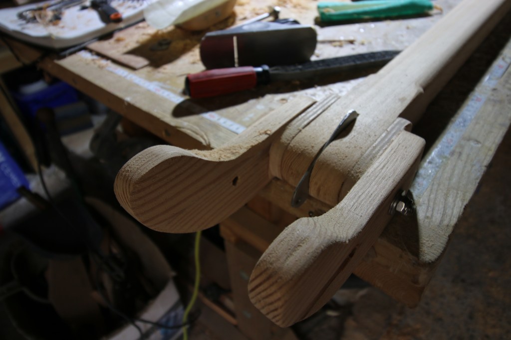 Version 3 has longer side cheeks with a better end (Jaw) curve and are partially faired into the wooden spar on full length spacers. I also made new spacer pads and left a bit more space between the rocker block pivot and the rounded end of the spar ; that’s because my plan is still to run the halyards in that space just as I did many years ago with the little Wharram Tiki 26 that I finished the build of. As I write, the final job for this stage was to round off the edges of the spar instead with a 2″ round-over cutter in my 1/2 inch router…..the one tool that I own that i’m a bit intimidated by. The actual last job was sweeping and then hoovering the entire workshop which by then was covered in shavings and waste from the router.
