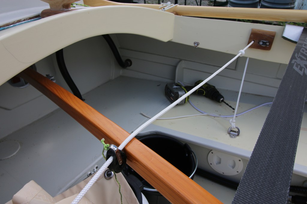 I didn’t quite expect to be in this state and position at the end of my third year on the project but what it does mean is that iv’e already got an autumn and winter’s worth of work to do – all written up on the inside of the shed door ; my functional aide memoire. With making a new bowsprit, adding fittings such as the mainsheet bridle and sheet bearer blocks (above) i’m already well stuck in with my rebuild of the rig. Some time during the winter I know that I have to make a shelter/tent for the boat to make the camping experience a lot more bearable. With having the existing rig off and on again this month I also messed around with designing a basic tent but one which would either be rigged over the lowered mainmast (part of the reason to build a lighter rig) or built more like a tarp-tent and rigged between masts.