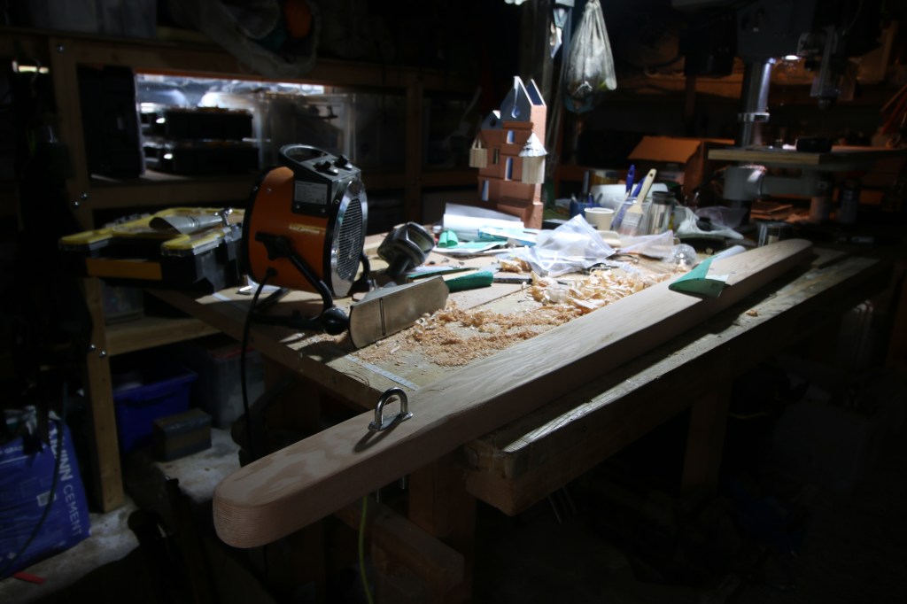 So yes, that’s the first project under way (making a new prod), in fact iv’e just come back into the house after flipping it over and coating the underside with epoxy resin. Next job for me today is to hoover through the house, empty the woodburner of ash and then head out for coffee with Jax before she heads off to singlehandedly rescue the NHS tonight ; it really is in a mess but perhaps a busier mess than my small damp workshop.