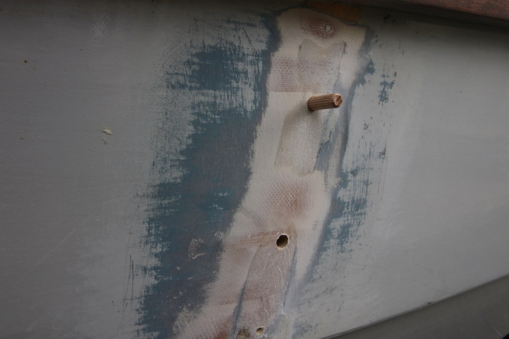 I had been thinking about the job above for some time as the boat’s top plank has got a bit scratched and ding’d over time ; in short I was thinking about flatting the existing paint on the top plank and then maybe smartening the whole boat by painting that plank a different color. As it happens the job of removing the chainplate bearers has made the repaint a necessity but also a good opportunity to do a bit of judicious filling and fairing.