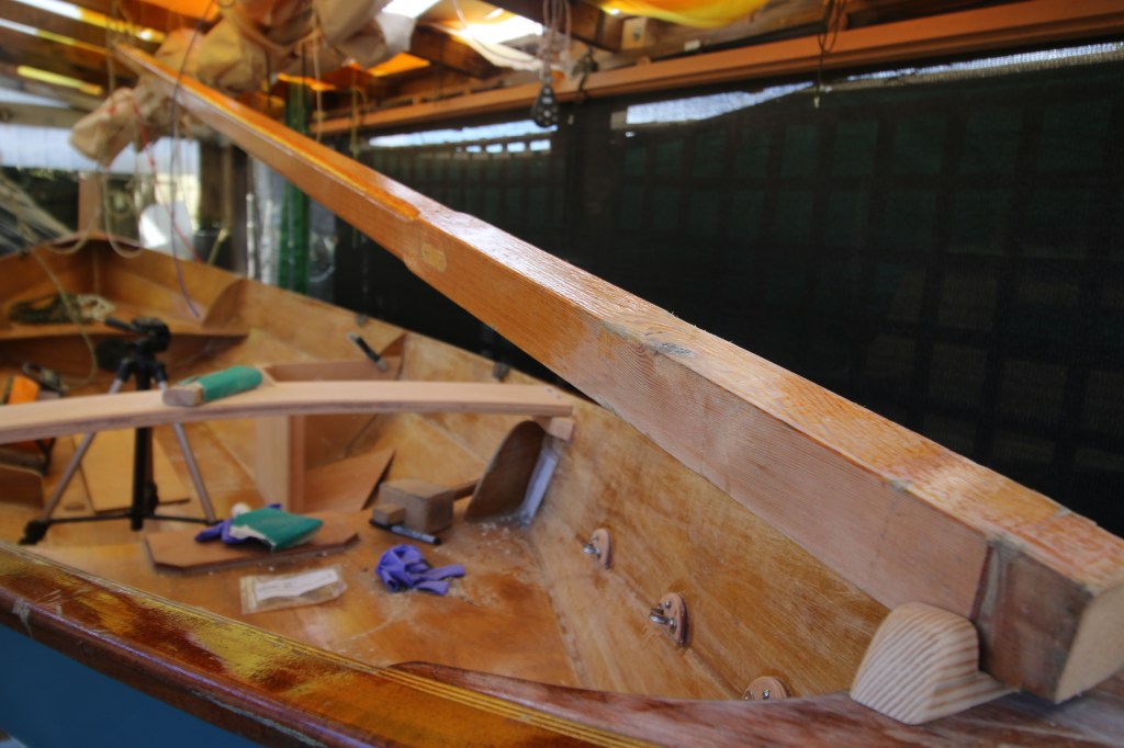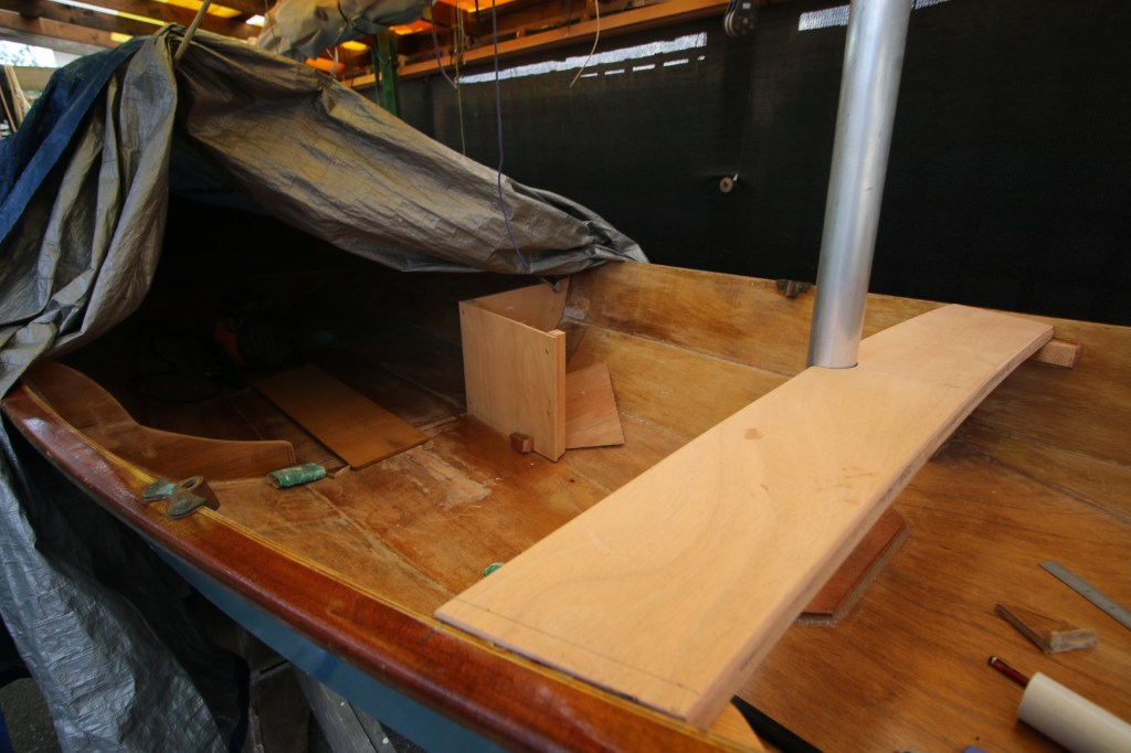 The first new structural element that I added is a new mast thwart just below deck level and it not only (obviously) supports the mast when it’s up but unlike the way that the Skerry is usually built and set up the mast can now be ‘walked in’ rather than having to be lifted vertically and dropped through the original ‘tank’ thwart and into the mast heel holder. My main reason for doing that is that the mast is quite heavy in it’s current form and would be difficult for me to step and unstep with the boat afloat – the main reason for unstepping the mast will be to then use it as the boat tent ridgepole. My eventual plan is to make and fit a lighter mast as I consider the existing one unnecessarily strong and heavy : I fancy carbon fiber tube as a replacement but will most likely end up with a sleeved alloy tube it being a lot cheaper than Carbon fiber.