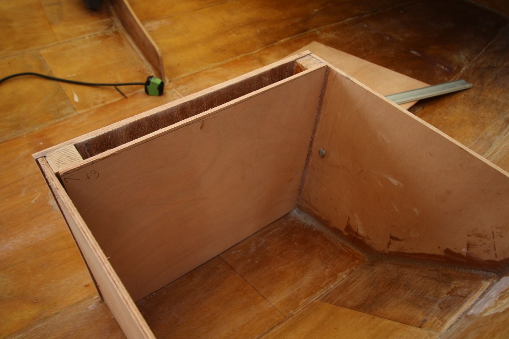 One of the main jobs iv’e been slowly working on is that of building the new buoyancy tank cum daggerboard box off to one side. It’s been a slow old job because I had to make a full set of patterns and I managed to get each piece slightly wrong several times. At time of writing and posting iv’e made all of the second stage patterns and i’m just waiting for the new plywood to arrive – the more accurate my patterns then the easier will be the actual work.