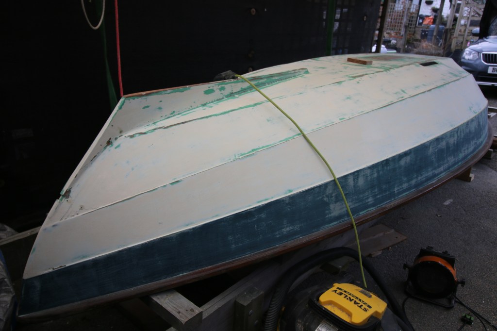 As I edit the post, ready to schedule it for a Monday morning, the Skerry is now bottom up on the outside bench and ready for a final wash down before I lay on the first coat of primer. The problem here is that it’s been either cold or cold and damp for weeks – around 5 or 6 degrees during the day so in my book that’s too cold for paint. The forecast later in the month is for a couple of days at a balmy 9 degrees so I may well do it then : as for now I am ‘icing the cake’ – covering the new daggerboard with epoxy and filler before several days to be spent with a longboard, fairing it to final shape.