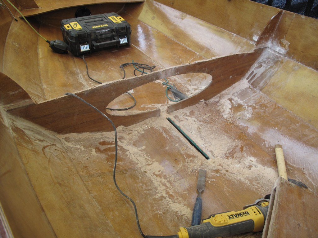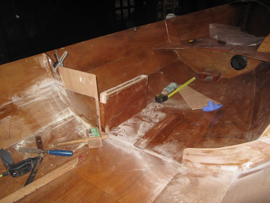Filling the original daggerboard slot and starting to cut and dry fit the case/box for a new, off center daggerboard – due to the depth of the case i’ll have to build a new and longer board. The frame/web to stbd will get trimmed back a few inches to aid in using a long and wide camping mat.