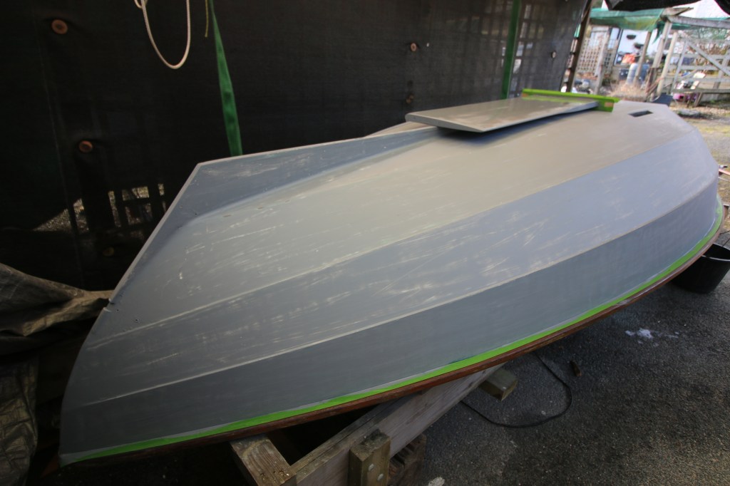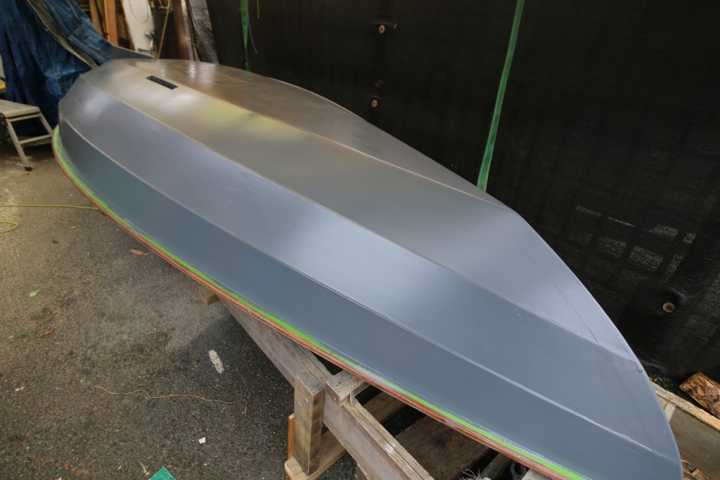 I thought I might have to write a long post about how I set about turning the lightweight CLC Skerry over compared to the two times that I had to do it with the Pathfinder but it was all done and dusted so quickly that I didn’t even have enough time to set up my GoPro to do a time lase sequence of me struggling. It wasn’t a struggle as the empty hull is only just beyond the weight of an open canoe so all I had to do was heave it up with a strap fore and aft and roll it over inside the straps. As I write, the hull has had several sessions with my noisy new sander and been finished with a long session with wet and dry paper used wet. Also, as I write it was too cold this morning to apply the next layer and I think, in these temperatures, that I need to leave the first coat another day to harden off although I did go ahead and soft/wet sand the hull by hand so it’s looking all smart in battleship grey primer. The photograph below is the one that I took after lightly sanding the hull with wet and dry paper used wet.