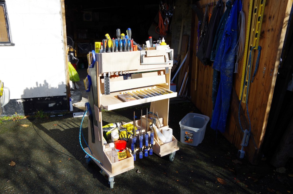 In the past I played around with wall mounted tool boards and never really got on with them eventually choosing to have nearly everything on a rolling tool cart inspired by film props maker Adam Savage. It worked well enough although it was difficult to move around inside the workshop because the original floor was so uneven – there being 5 different levels of bricks as flooring, huge Granite blocks as flooring and builders waste covered with a thin screed of concrete for the rest – even that it came in at least two levels !. Working with it outside was simply a no-go because I couldn’t heave it over the concrete sill at the entrance and I built most of my boat with tools that I tended to carry around in a builders bucket – oh, and with a pencil tucked behind my ear so as not to lose every last pencil I owned.