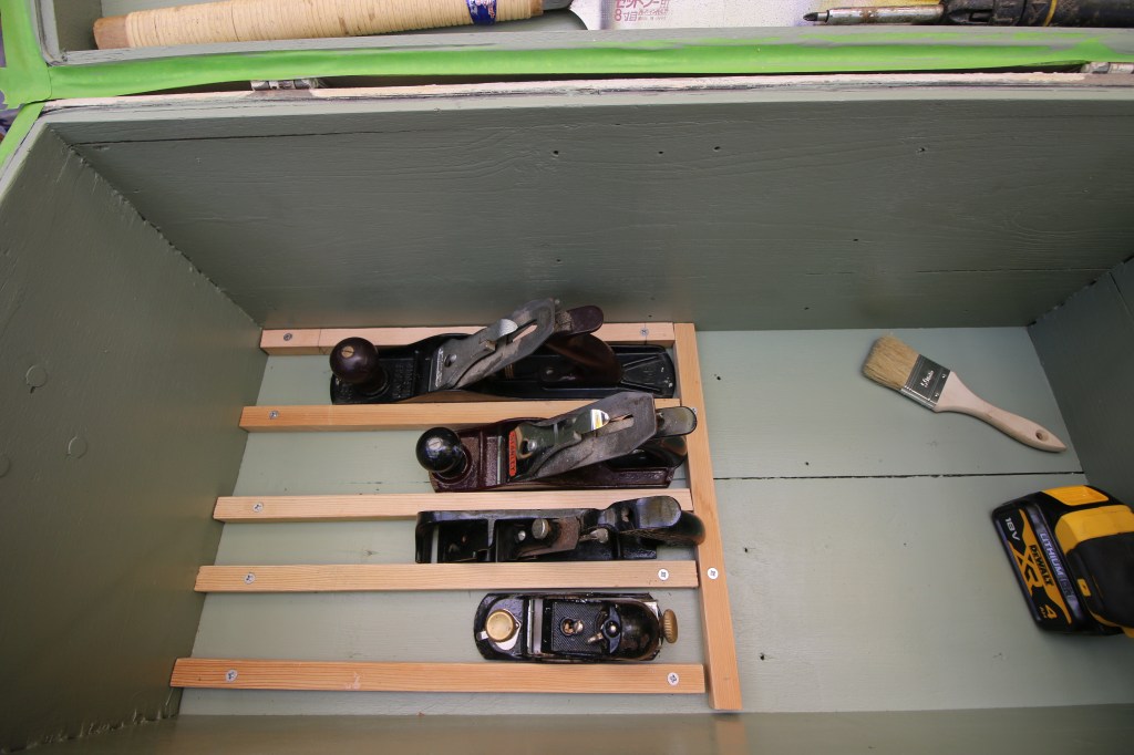 Below : the work in progress, the inside of the chest has been sanded and painted, bottom dividers screwed in place to hold my planes, and, as I write, iv’e fitted the cleats to mount the till.
