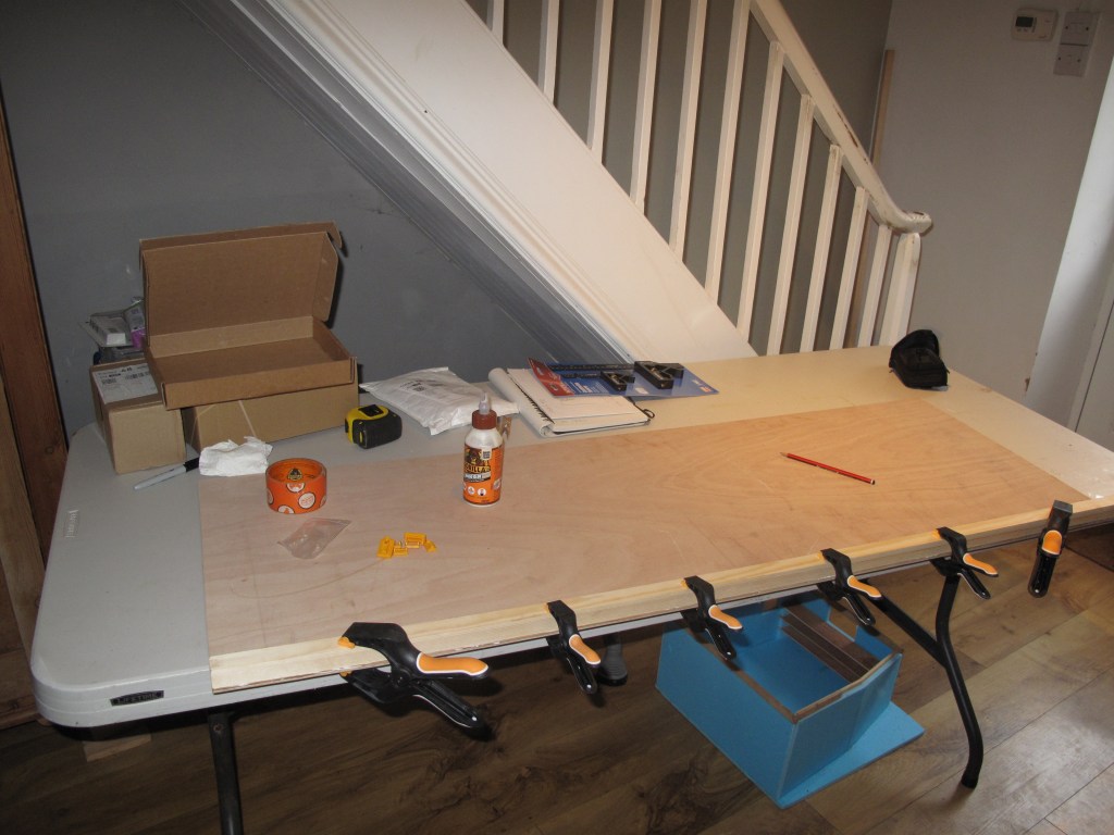 My first time table set up wasn’t successful as, once again. I failed to read the fine print in the description. What I thought I was getting was a shorter version of my large worktable but the new one is a folding version and when it’s unfolded and up it doesn’t have a level top and that’s something I need. I spent a bit of time trying to find a piece of scrap plywood to make a temporary work surface out of and while I eventually managed to find and cut a piece it doesn’t quite fit to day one and two were : table not quite right, worksurface doable but not quite right and lights need more accessories to be functional. Typical day one of a project then !