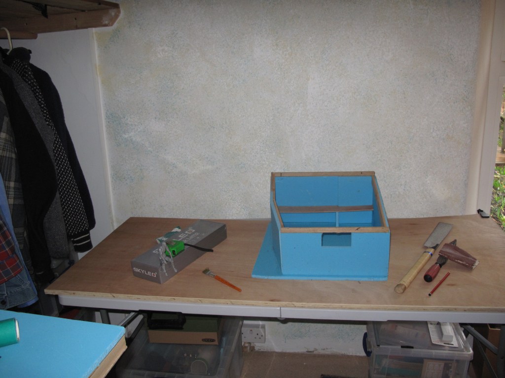 The next thing I realized is that this worktable is not only an experiment in preparing to set up the larger and more permanent one in the workshop but it’s an experiment in having everything I need in one place to work with : Savage would call it flow and first order retrievability of tools and materials rather than spending time searching through my various crates and bits boxes. One of the early things I did was to make a list of everything I might use in a modeling project and adapt the workstation to have all of those things to hand : then of course I realized that lots of things on that list I would never use inside the house – my rattle can primers for example – but I might need a way of having my Dremel spinny thingy where I can put my hand on it rather than wandering down the yard and searching for it. I haven’t solved that one yet as it would seem to need something like a dentists work table or the kind of endoscope station we had in my last job.