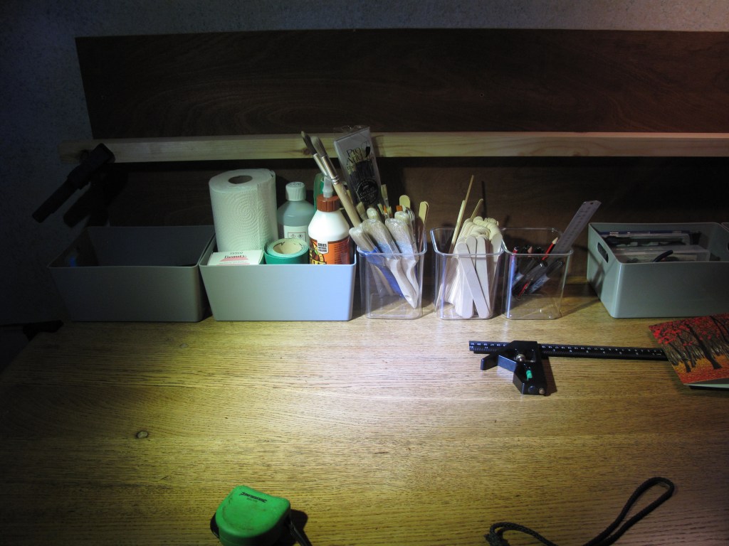 The workstation gets a temporary back board, tool rail and kitchen storage containers for some of the materials I use. It’s not great and it immediately suggests a remake to produce the similar thing but one further iteration towards eventual success or at least functionality.