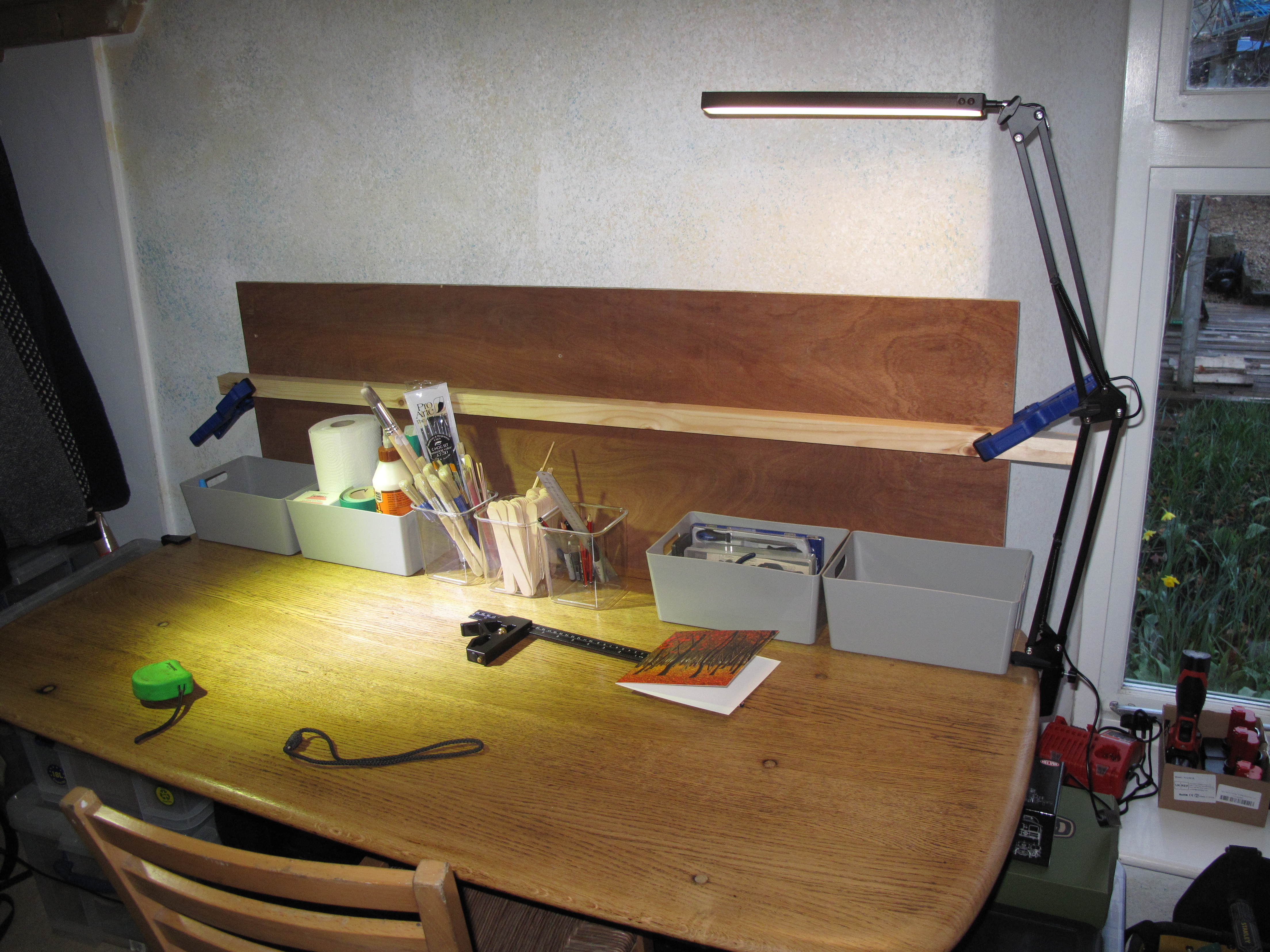 With doing most of my early crafting and modeling work down in the kitchen I felt that I couldn’t have a permanently set up modeling bench there as we all know that any horizontal surface rapidly becomes the temporary home of anything else which we haven’t immediately put away. Thus I kept everything in a series of stackable plastic crates and any job took a lot longer than it should do as it took a significant amount of time to find anything – for some things I even used to have to walk down to the old boatbuilding space outside if I suddenly needed something that I knew wasn’t in the house. This feature was a bit like the days when I had a large tool collection living on my boat and a second one that had to be transportable in the back of the car for when the boat was in the yard : climbing up and down a ladder multiple times for that one tool iv’e forgotten yet again gets really tiresome.